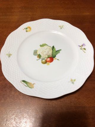 Elegante piatto in porcellana Herend, con un delicato motivo floreale e vegetale dipinto a mano. - Motivo centrale con cavolfiore, pomodori e altre verdure. - Bordi ondulati con decorazioni a rilievo. - Piccoli fiori e foglie sparsi sul bordo. -diametro cm 20,8
