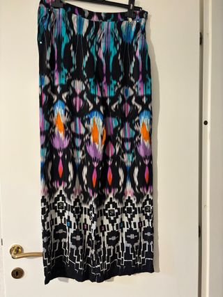 Pantaloni eleganti in pura seta con una stampa vivace e colorata. Il modello è caratterizzato da un design unico e un fondo con un motivo geometrico marca 22 Maggio by Maria Grazia Severi - Tessuto: 100% Seta - Taglia: XXXL / 46 / 18 - Dettagli: Stampa ikat multicolore e motivo geometrico sul fondo