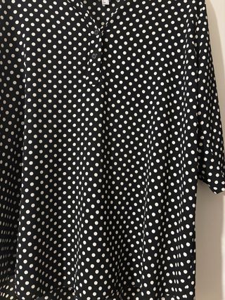 Camicia a pois bianchi su fondo nero, con colletto alla coreana e chiusura con bottoncini. - Maniche a 3/4. - Orlo asimmetrico. - Tessuto leggero e fluido.