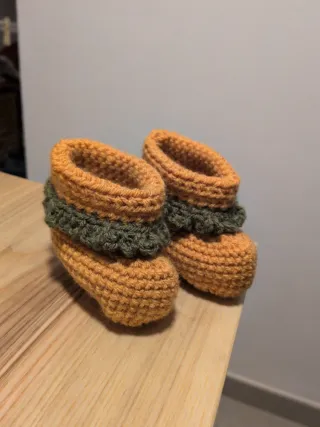 Deliziose scarpine fatte a mano all'uncinetto per neonati, perfette per tenere al caldo i piedini. - Colore principale arancione. - Dettaglio a contrasto verde. - Design a stivaletto.