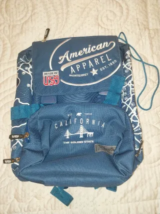 Zaino American Apparel con stampa California e Made in USA. - Design con mappa degli Stati Uniti. - Dettagli in blu e turchese. - Chiusura con zip e fibbie.