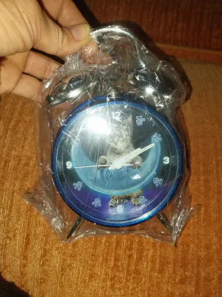 Orologi sveglia nuovo con un simpatico disegno di gatti. 5€ l'uno a scelta - Quadrante blu con decorazioni a tema felino. - Struttura in metallo con campane. - Piedini di supporto.