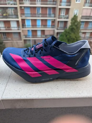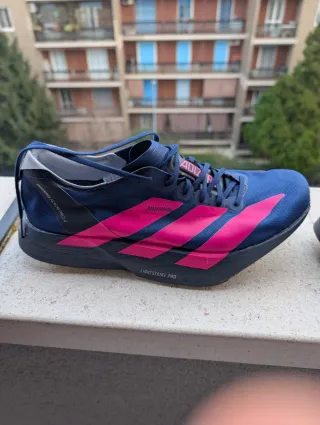 Adidas Adizero Adios Pro 4, taglia 43 1/3 (9 1/2 US) Quasi nuove, utilizzate per soli 21Km lenti per rodaggio. Di solito per le Adidas il 43 e 1/3 è il mio numero abituale ma in questo caso sono leggermente strette, motivo per cui le vendo. Le consiglio a chi di norma usa un 9US su altre scarpe