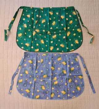 Set di due grembiuli con una simpatica fantasia di limoni. - Grembiule verde con limoni gialli e fiori bianchi. - Grembiule blu con limoni gialli e fiori bianchi. - Tasche frontali su entrambi i grembiuli. - Laccetti per legare in vita.