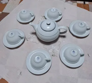 Elegante servizio da tè in porcellana bianca, perfetto per ogni occasione. - Include teiera e sei tazze con piattini. - Design classico con sottili linee blu. - Materiale: porcellana.