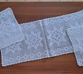 Delizioso set di tre centrini realizzati a mano all'uncinetto. Perfetti per aggiungere un tocco di eleganza alla tua casa. - Il grande misura 61x26, i 2 piccoli misurano 32x24. - Lavorazione artigianale. - Design floreale traforato. - Bordi rifiniti con grazia.