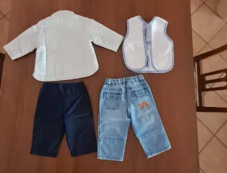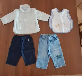Set primaverile per bimbo composto da giacca, bavaglino e pantaloni. - Giacca imbottita bianca con bottoni Mirtillino. - Bavaglino bianco con simpatici disegni. - Pantaloni blu Mirtillino. - Pantaloni in jeans chiari Benetton.