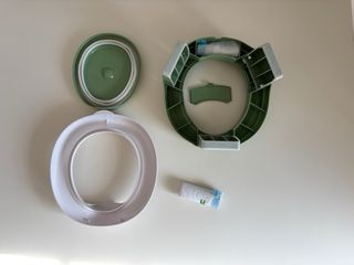 Set per l'addestramento al vasino e riduttore per WC. - Vasino con interno bianco e esterno verde. - Riduttore per WC bianco. - Anello di supporto verde. - Due sacchetti igienici.