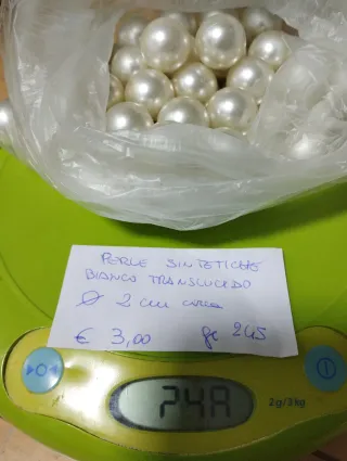 Lotto di perle sintetiche color bianco translucido, ideali per creazioni artigianali. - Perle tonde di circa 2 cm - Superficie liscia e lucida.