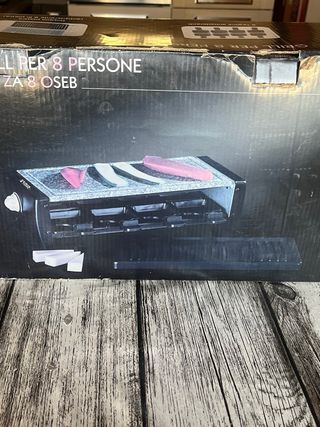 Grill bistecchiera con piastra in pietra e poastra antiaderente per 8 persone con 8 raclette,presenta piccoli difetti di conservazione visibili in foto,le raclette sono nuove - Piastra in pietra. - 8 pirottini per raclette.