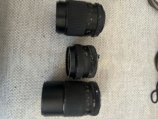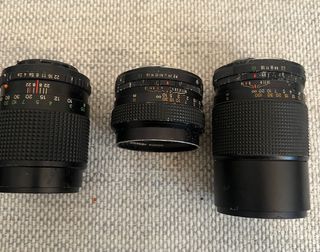L'obiettivo all'estrema sinistra è un Petri 135mm f/3.5 MC con attacco Pentax K. Al centro si trova un Konica Hexanon AR 50mm f/1.7, un obiettivo standard molto luminoso noto per la sua qualità ottica. L'obiettivo a destra è un teleobiettivo Konica Hexar AR 135mm f/3.5