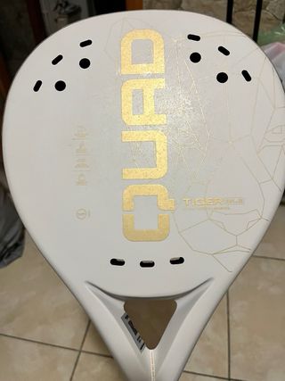 Racchetta da padel Quad Tiger in perfette condizioni, utilizzata solo per test. - Modello: Quad Tiger - Condizioni: Usata come test - Colore: Bianco con dettagli oro