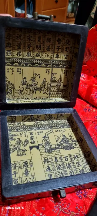 Antica bussola cinese Luo Pan, utilizzata per il Feng Shui. Presenta una scatola decorata con motivi floreali e uccelli. - Bussola Luo Pan. - Scatola in legno decorata. - Motivi floreali e uccelli sulla scatola.