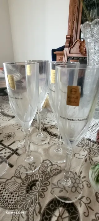 Eleganti flute da champagne con design dell'architetto Taddei. Sestina kristal - Design del 1970. - Etichetta originale Arch. Taddei-Sestina Set di 4 bicchieri design floreale