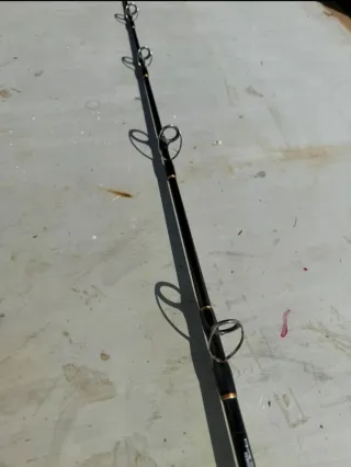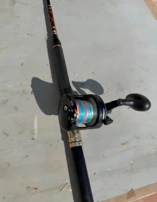 Vendo combo da pesca Okuma composto da canna e mulinello. - Canna da pesca di colore nero con dettagli decorativi. - Mulinello nero con filo multicolore.