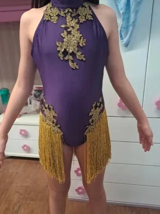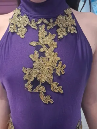 Abito da ballo viola scintillante, perfetto per le competizioni. Presenta dettagli floreali dorati ricamati sul corpetto e sulle fiancate, con una cascata di frange dorate che aggiungono movimento. - Scollo alto stile halter. - Decorazioni floreali applicate. - Frange lunghe e scintillanti.