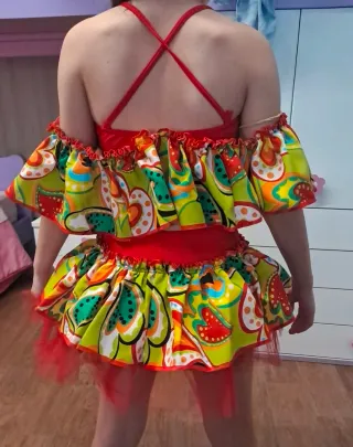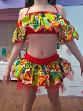 Completo per danza composto da top e gonna. - Top con maniche a volant e stampa vivace. - Gonna corta con elastico in vita e dettagli in tulle rosso.