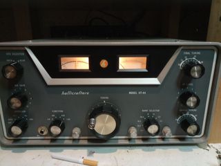 Trasmettitore Hallicrafters modello HT-44. Perfettamente funzionante e, come si vede dalle foto, si mostra come nuovo. Trasformatore dedicato per funzionamento a 220V con Bios regolabile. - Selettore VFO. - Guadagno microfono. - Selettore banda. - Sintonizzazione finale. - Livello RF. - Sintonizzazione driver.