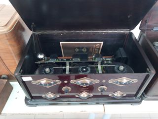 Radio d'epoca Grebe Synchrophase MU1 del 1925. Completo del suo originale libretto dell'epoca. Questo modello venne montato in una Torpedo al Tour. - Lo zoccolo delle valvole è montato su molle per avere elasticità e la radio era poggiata sul sedile posteriore. - Componenti interni visibili. - Manopole e quadranti decorativi.