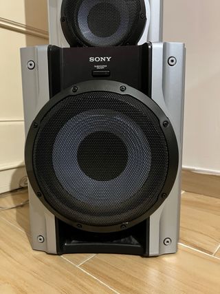 Sistema audio Sony composto da un subwoofer e due casse. - Design elegante in argento e nero. - Ideale per migliorare l'esperienza sonora.