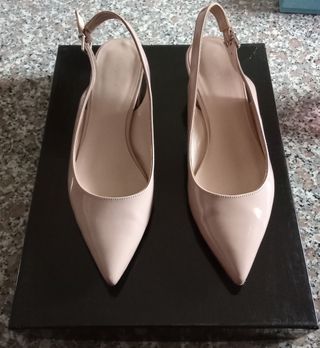 Eleganti scarpe slingback con tacco. - Colore rosa antico. - Punta affusolata. - Cinturino alla caviglia con fibbia.