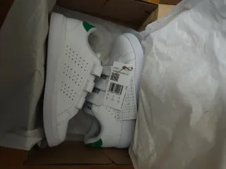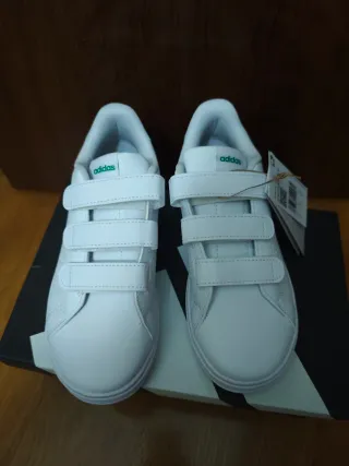 Scarpe da ginnastica Adidas Advantage Base 2.0 per bambini. - Colore bianco con dettagli verdi. - Chiusura a strappo. - Design traforato. -Taglia 34