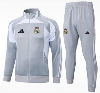 Completo da allenamento del Real Madrid. - Giacca sportiva grigia con logo Adidas e stemma del Real Madrid. - Pantaloni sportivi grigi con strisce Adidas e stemma del Real Madrid.