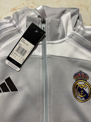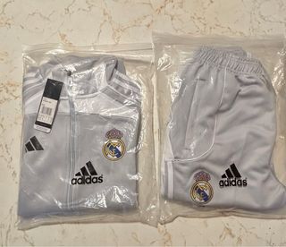Completo set sportivo del Real Madrid. - Giacca con zip. - Pantaloni con elastico in vita. - Logo Adidas e stemma del Real Madrid presenti su entrambi i capi.