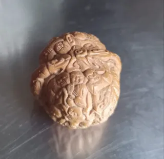 Meravigliosa noce intagliata a mano, un pezzo unico di arte cinese. - Con 21 volti 19 volti umani e 2 scimpanzé. - Primi anni del 1900. - Con elegante borsetta ricamata di tessuto blu, leggermente scolorita su un lato. L'intaglio dei noccioli ha una lunga storia che risale alla dinastia Song (960–1279), e la sua popolarità è cresciuta soprattutto durante le dinastie Ming e Qing.