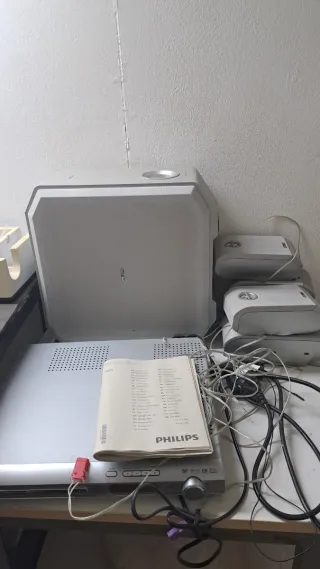 Sistema Home Theater Philips completo, ideal para crear una experiencia de cine en casa. NO telecomando - Unidad principal de color plateado y blanco. - Incluye manual de instrucciones Philips.