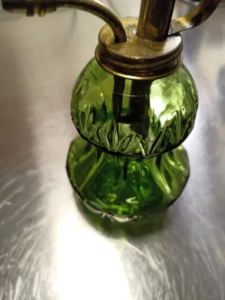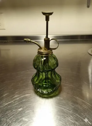 Elegante spruzzino in vetro verde, ideale sia come atomizzatore per profumi che come nebulizzatore per piante. Il design classico lo rende un accessorio decorativo. - Articolo vintage, 1990. - Molto apprezzato dai collezionisti o da chi cerca attrezzi da giardinaggio esteticamente gradevoli. - Corpo in vetro lavorato. - Meccanismo a pompetta in ottone. - Perfettamente funzionante, testata. - Altezza vetro 12 cm, con il pistone arriva a 20 cm diametro 9 cm.