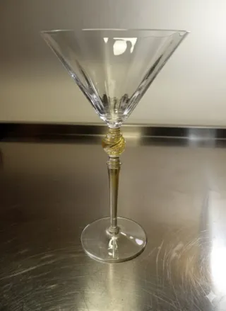 Elegante coppa da Martini realizzata in vetro di Murano con inclusioni di oro 24 carati nello stelo ritorto. Sono prodotti dalla manifattura veneziana Cenedese, attiva dal 1946 e nota per le sue creazioni artistiche in vetro soffiato. - Materiale: Vetro di Murano con oro 24 carati. - Designer/Manifattura: Giovanni Cenedese / Manifattura Cenedese. - Epoca: Oggetti simili sono spesso datati tra gli anni '80 e '90. * Firma: I pezzi autentici sono solitamente firmati, spesso con un'incisione all'acido. Un pezzo unico che aggiunge un tocco di lusso alla tua tavola.