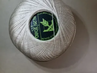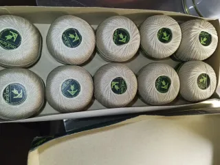 Scatola di filo di Scozia, ideale per lavori all'uncinetto. - 10 gomitoli di filo di Scozia. - Colore beige chiaro. - Etichetta con indicazione N.25 e 0.60.
