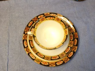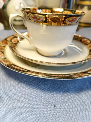☕Trio Tazza, Piattino e Piatto Dolce Antico - Royal Albert, del 1917 (Inclusa Garanzia) Rarissimo Trio Vintage Royal Albert in Fine Bone China (porcellana inglese) composto da tazza da tè/caffè, piattino e piatto dolce. Dettagli: Marca: Royal Albert, Inghilterra. Modello/Decorazione: N. 1047 (come indicato sulla garanzia). Epoca: realizzato nel 1917 come da certificato. Stile: Ricco bordo decorativo a fasce geometriche e ovali con inserti floreali in tonalità calde (arancione, marrone, nero) e abbondante finitura in oro zecchino, sia sul bordo che all'interno della tazza e sui profili. Design elegante.