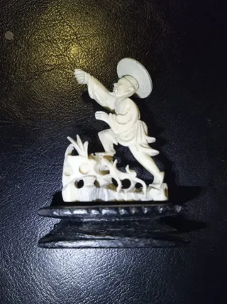 Deliziosa statuina realizzata in osso, finemente intagliata. - Raffigura una figura maschile con cappello. - Base in legno scuro intagliato.