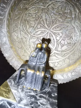 "Innamorati" scultura in bronzo, coppia seduta su una panchina, appoggiati su base di marmo nero e venature bianche. Opera realizzata per Spirale Arte da Nino Tassone, nel 1980 circa. Scultura 8 cm x 6 cm. Base in marmo 9 cm x 9 cm. Venduta da I Bellucci Perugia. Solo la scultura con la base in bronzo Euro 80. Piatto antico in ottone fine del 1800, fatto a mano, probabilmente di origine araba, diametro 23 cm. Euro 70. Insieme scultura e piatto Euro 120.