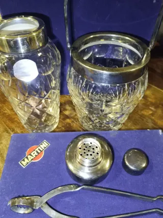 Set Martini composto da porta ghiaccio e shaker. - Porta ghiaccio in cristallo molato con finiture in metallo placcato in argento. - Shaker in cristallo molato con tappo e filtro in metallo placcato in argento. - Include pinza per ghiaccio. La scatola originale presenta qualche segno del tempo.