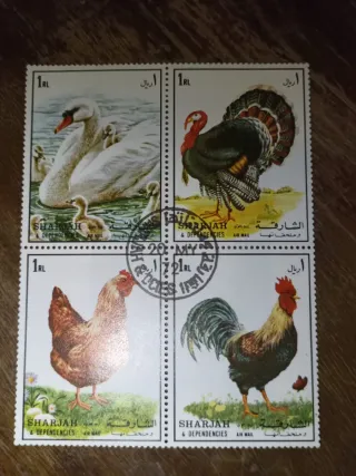 Set di 4 francobolli emessi da Sharjah & Dependencies. - Raffigurano diversi uccelli: cigno, tacchino, gallina e gallo. - Valore nominale di 1 RL ciascuno. - Dettagli AIR MAIL e SHARJAH & DEPENDENCIES.