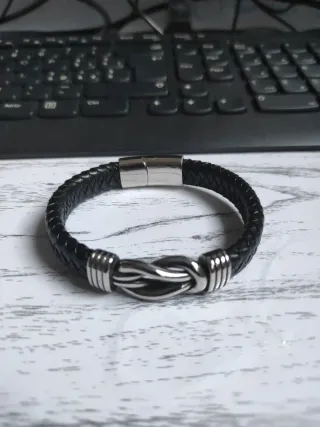 Elegante bracciale da uomo realizzato in cuoio intrecciato con dettagli in acciaio. La chiusura è dotata di clip magnetiche per una facile e sicura applicazione. - Design con nodo centrale in acciaio. - Chiusura magnetica robusta.