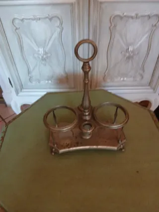 Elegante porta bottiglie antico, perfetto per aggiungere un tocco di classe alla tua tavola o come pezzo d'arredo. - Struttura in metallo con finitura anticata. - Design a due posti con manico centrale ad anello. - Base stabile con piedini. - Dettagli decorativi sulla struttura.
