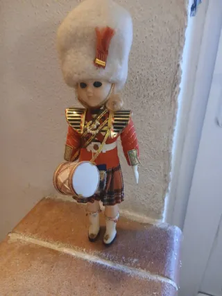 Bambola vintage in stile soldatino con tamburo. - Cappello alto in pelliccia bianca con piuma rossa. - Uniforme rossa con dettagli dorati e neri. - Gonnellino a quadri scozzesi. - Scarpe bianche. - Tamburo decorato con nappe dorate.