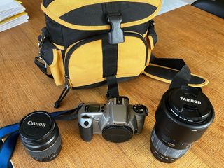 Fotocamera reflex Canon EOS 3000 del 2006, con finiture grigie e gialle. Ideale per appassionati di fotografia. - Obiettivo Canon 28-80mm. - Obiettivo Tamron aggiuntivo 70/300 - Zaino per fotocamera.