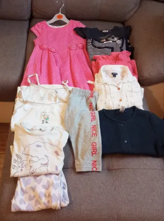 Lotto composto da 10 capi di abbigliamento per bambina, ideali per la stagione primaverile. - Vestito rosa a pois bianchi con fiori (majoral) - Maglietta a righe blu e bianche ( okaidi) - Maglietta rosa. - Camicia bianca a maniche lunghe con bottoni. - 2'canotte bianche con disegno di pecora ( Happy people) - pigiama manica lunga con disegno di giraffa. - Pantaloni 3/4 grigi con scritta GIRL NICE. - Cardigan blu scuro trapuntato ( okaidi) - Maglietta manica lunga hello Kitty ( original marines) Tutto in ottimo stato