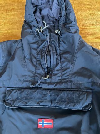 Giubbotto Napapijri originale per bambino/a di 12 anni. - Colore blu navy. - Cappuccio. - Tasca frontale. - Logo Napapijri sulla tasca. Piccolo foro come in foto