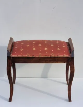 Elegante panca antica con seduta imbottita. - Struttura in legno massello, in ottimo stato - Rivestimento in tessuto decorato, da sostituire - Gambe curve in stile classico.