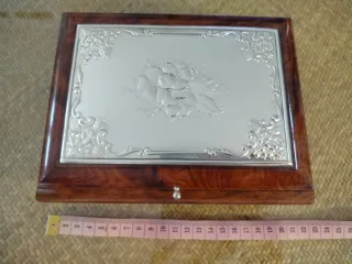 Elegante cofanetto portagioie Valenti, nuovo e mai usato. La sua finitura in legno scuro si abbina perfettamente al pannello centrale in argento 925 lavorato. - Dettagli floreali in rilievo sul pannello in argento. - Chiusura con piccolo pomello decorativo. Nuovo mai usato con confezione originale con garanzia Misure 23x16 #cofanettoargento #valentiargento #portagioieargento #argentocongaranzia #valenticongaeanzia