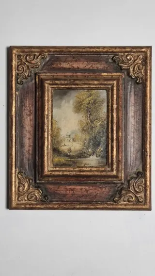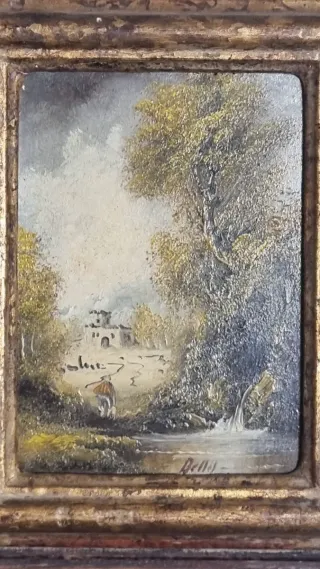Miniature Dipinto Olio su Rame Cornice dorata Paessaggio. Misure cornice: Lunghezza 20.5 cm Altezza 24 cm Misure dipinto : Lunghezza 8 cm Altezza 11 cm