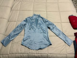 Elegante camicia a maniche lunghe. - Tessuto satinato lucido. - Scollo a V con colletto alto. - Maniche lunghe con polsini. - Vestibilità aderente. -taglia IV