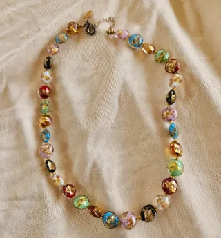 Splendida collana realizzata con perle in vetro di Murano. - Perle sfaccettate con inclusioni dorate. - Design unico e colorato. - Chiusura a moschettone dorata.