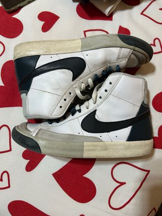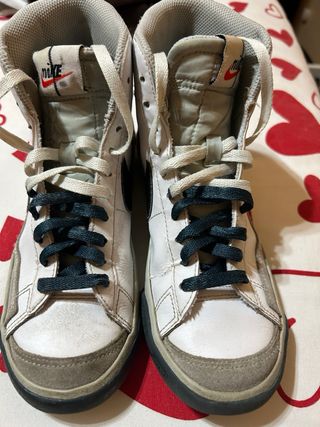 Scarpe Nike Blazer Mid '77 numero 36,5 colore bianco e Verdone con simbolo nero, stringhe di doppio colore, - Design alto e iconico. - Tomaia in pelle bianca con dettagli verdone scuro. - Suola in gomma resistente. Usate, ma in buone condizioni ancora per potere essere utilizzate